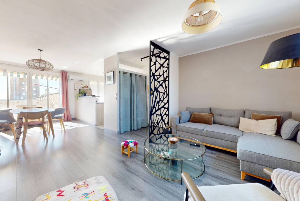 Cet appartement rénové avec goût, très lumineux et climatisé, se compose d’une entrée avec placard de rangement, d’un salon séjour/salle à manger traversant EST-OUEST donnant sur un balcon avec vue, d’une cuisine ouverte entièrement aménagée et équipée ( + espace buanderie ) donnant également sur un balcon avec vue.