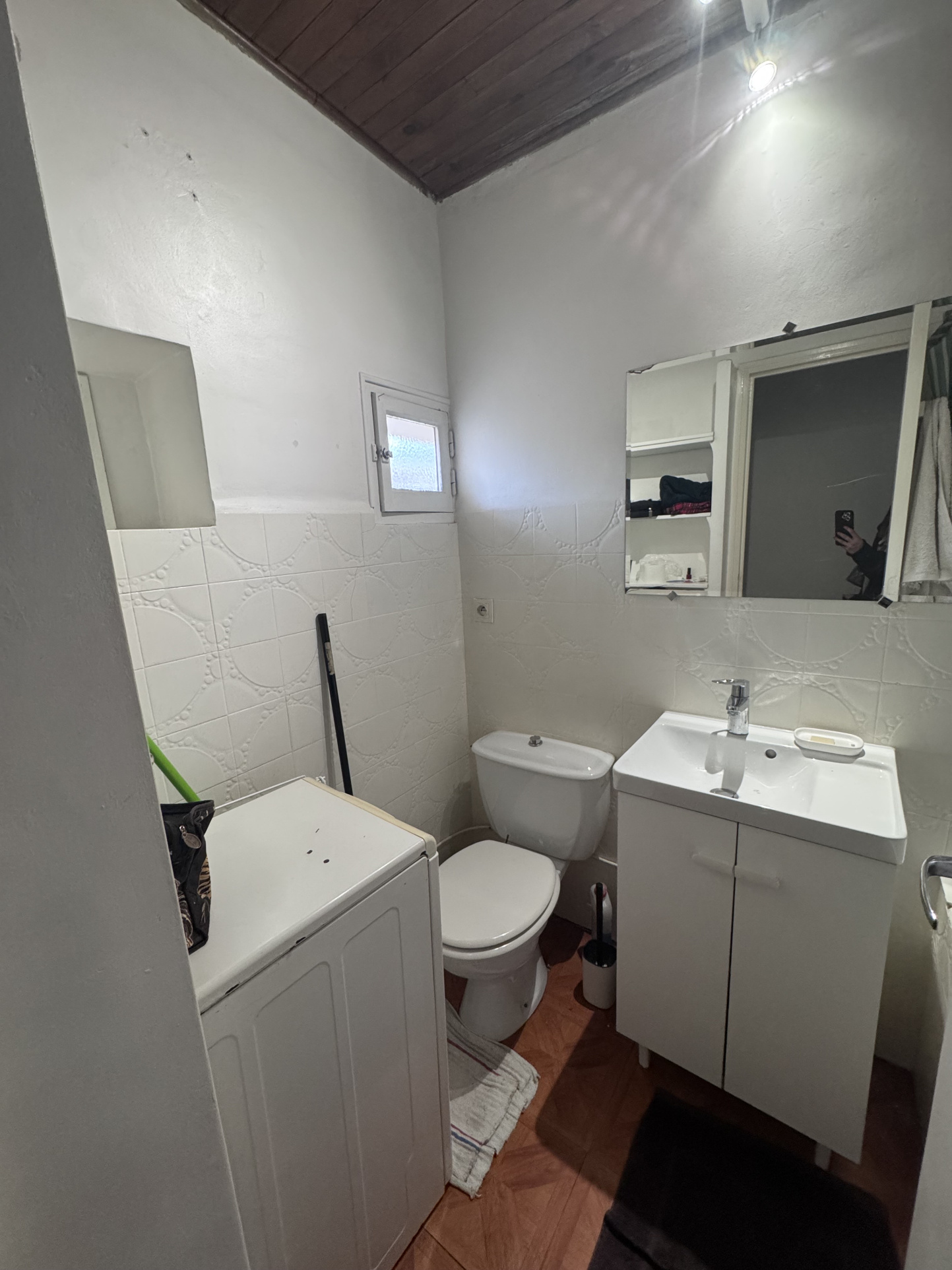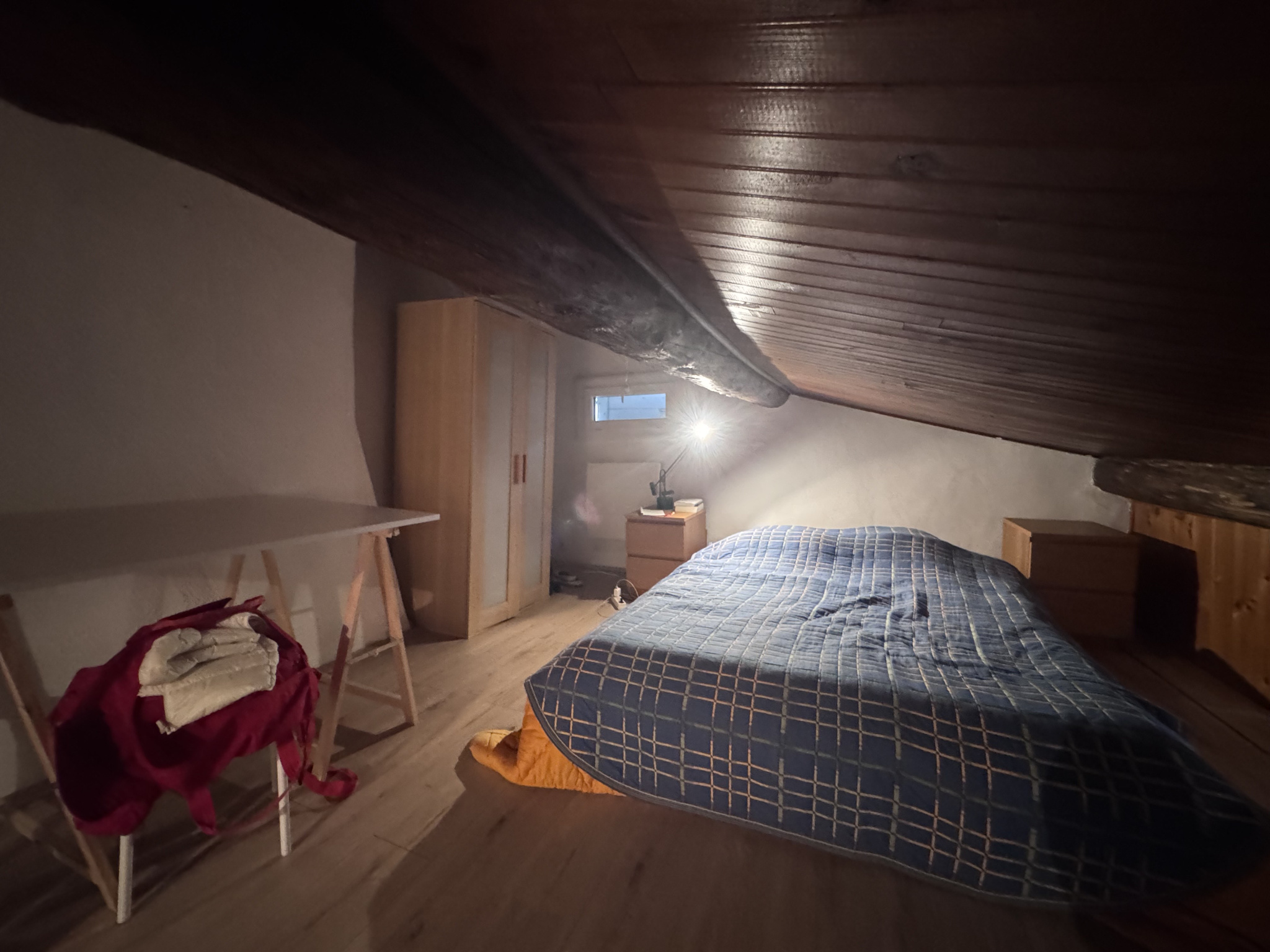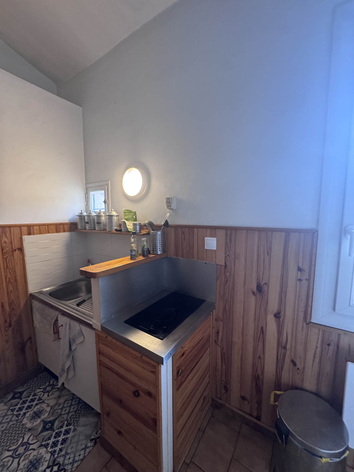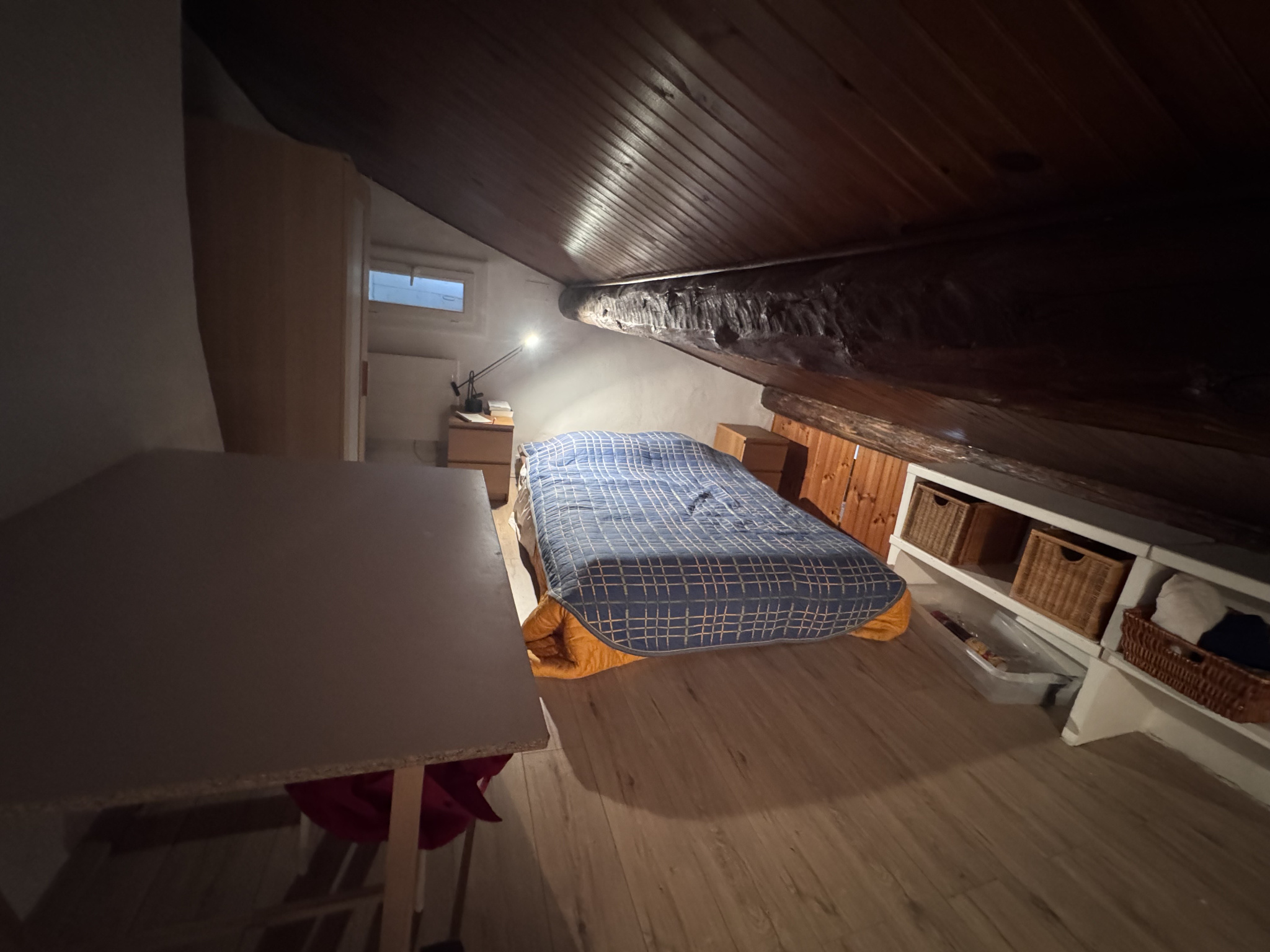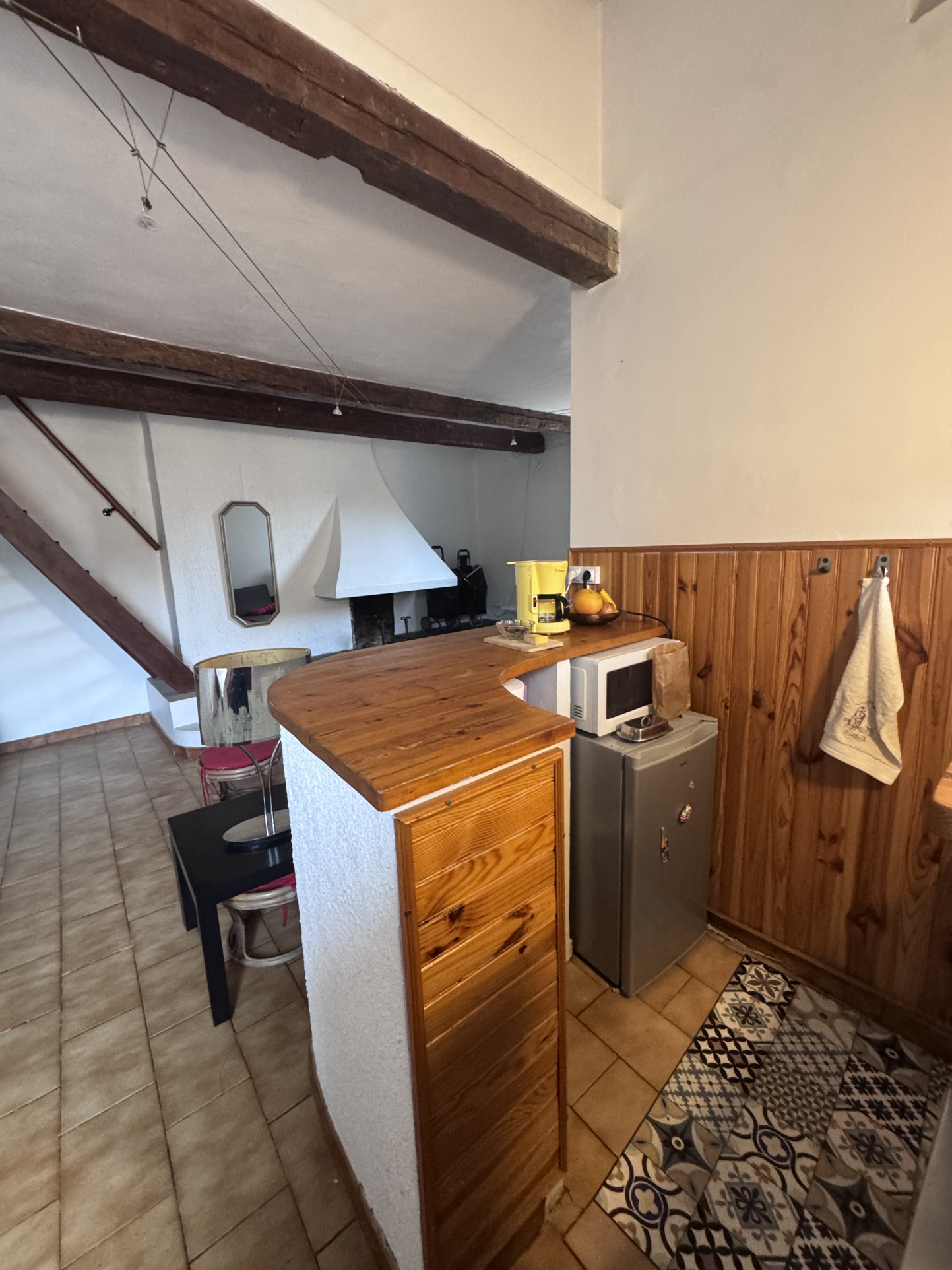Composé d’une entrée, un séjour spacieux avec canapé, table basse et cheminée, une cuisine ouverte avec table et chaises, aménagée et équipée de plaques de cuisson vitrocéramiques, réfrigérateur top et micro-ondes, une mezzanine pouvant faire office de coin nuit ou de bureau et une salle de bains avec baignoire, meuble vasque, lave-linge et wc.