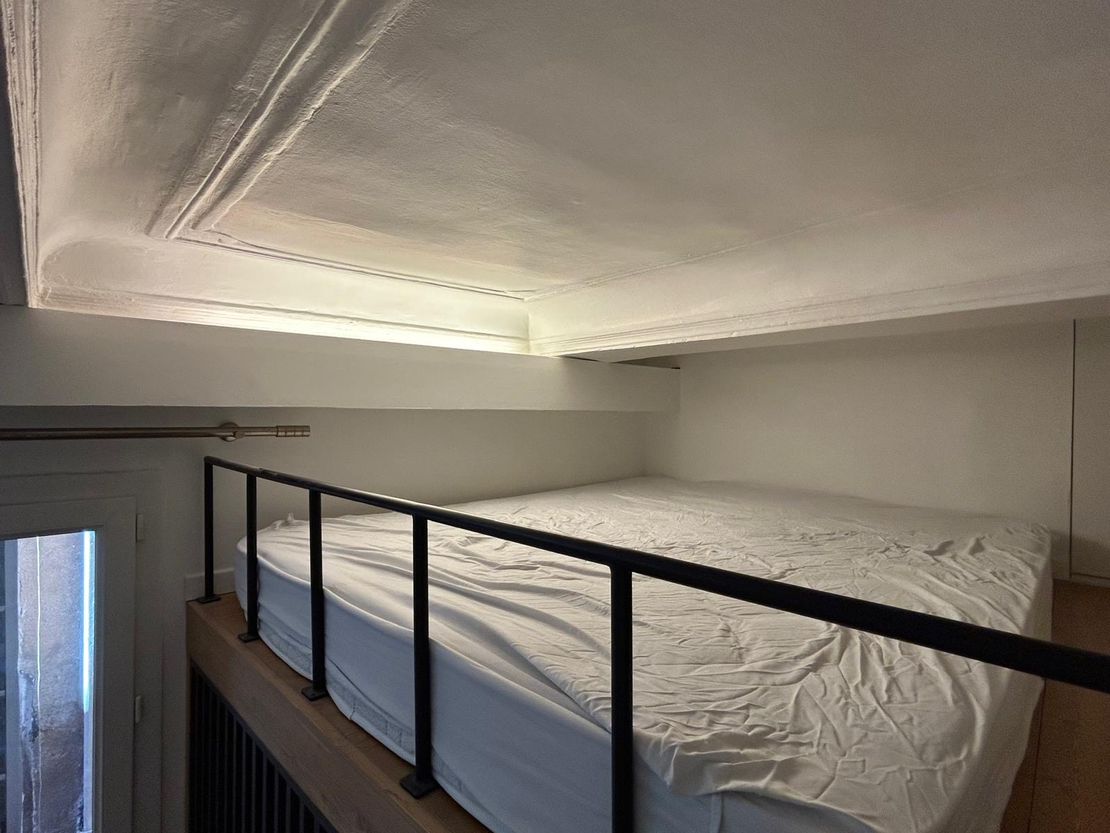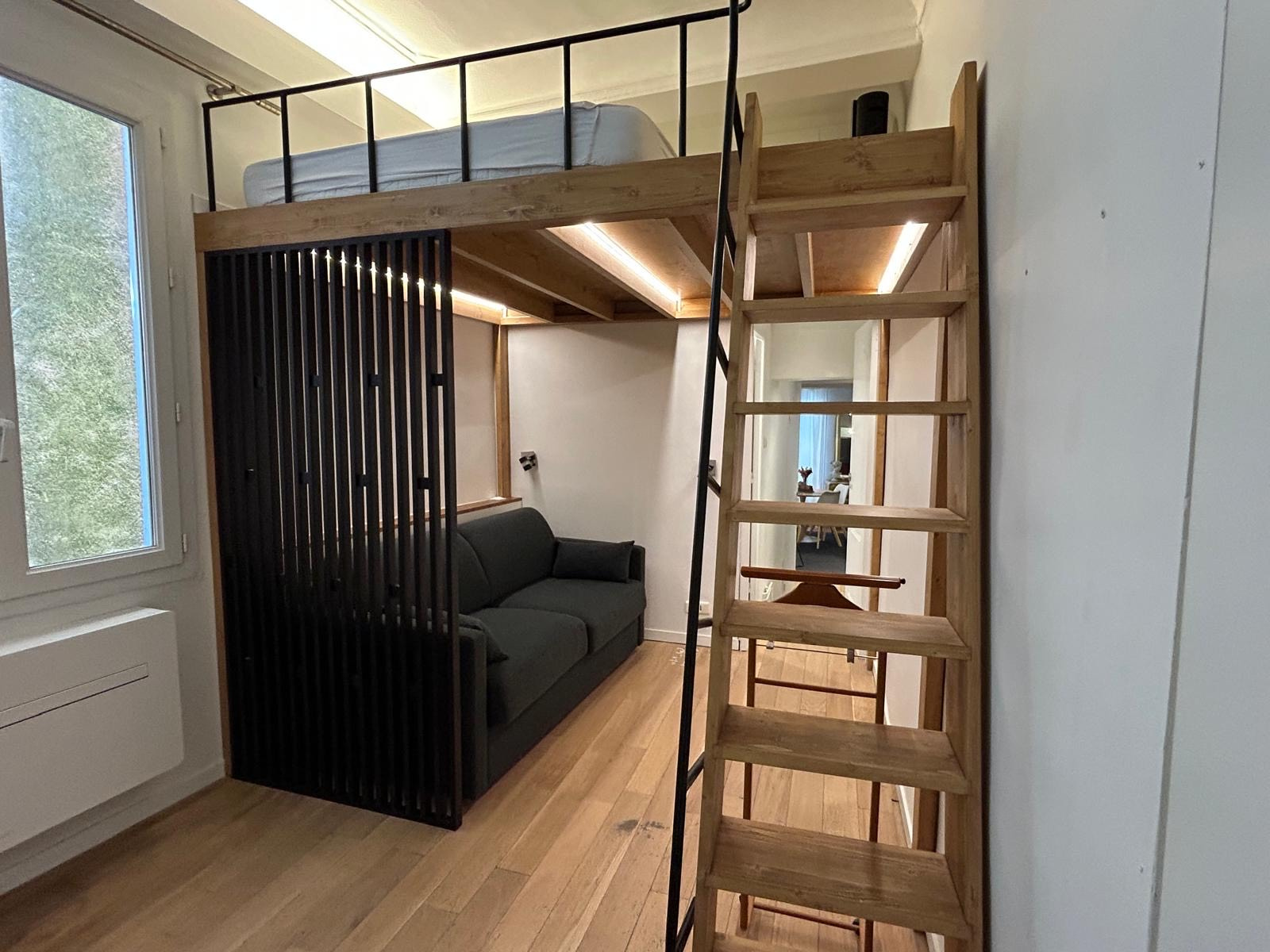 Composé d’une entrée/chambre d’environ 12 m2 avec canapé convertible, mezzanine et placards intégrés sur-mesure, un séjour spacieux et lumineux avec canapé, table basse, coin repas et cheminée décorative, une cuisine ouverte, aménagée et équipée de plaques de cuisson vitrocéramiques, hotte, four, micro-ondes, réfrigérateur combiné, lave-vaisselle et lave-linge, une salle d’eau moderne avec douche, meuble vasque et wc séparés.