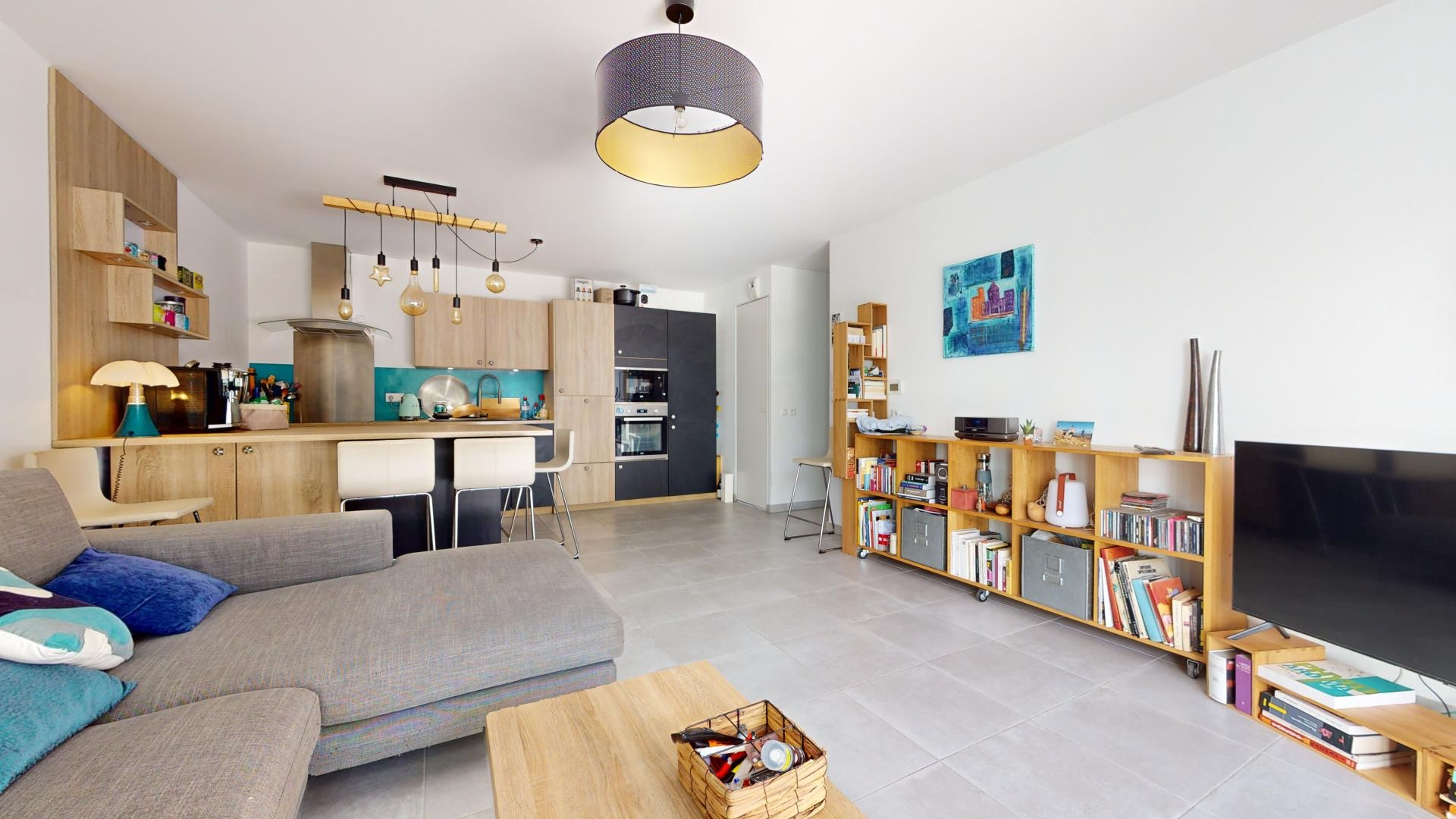 La pièce à vivre de 36 m2 avec cuisine ouverte entièrement aménagée et équipée avec des matériaux de qualités s’ouvre sur la terrasse de 70 m2 et le jardin arboré de 40 m2.