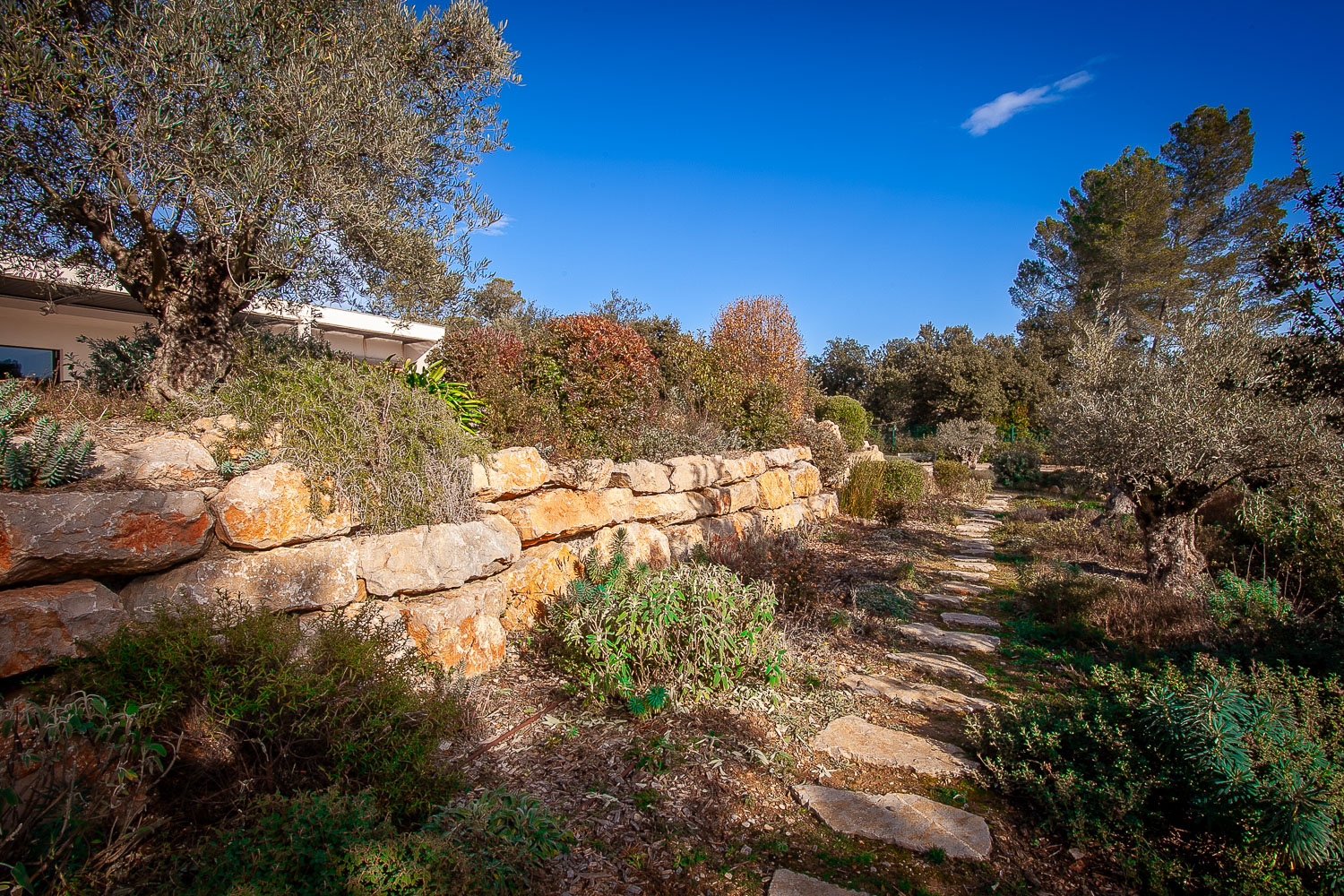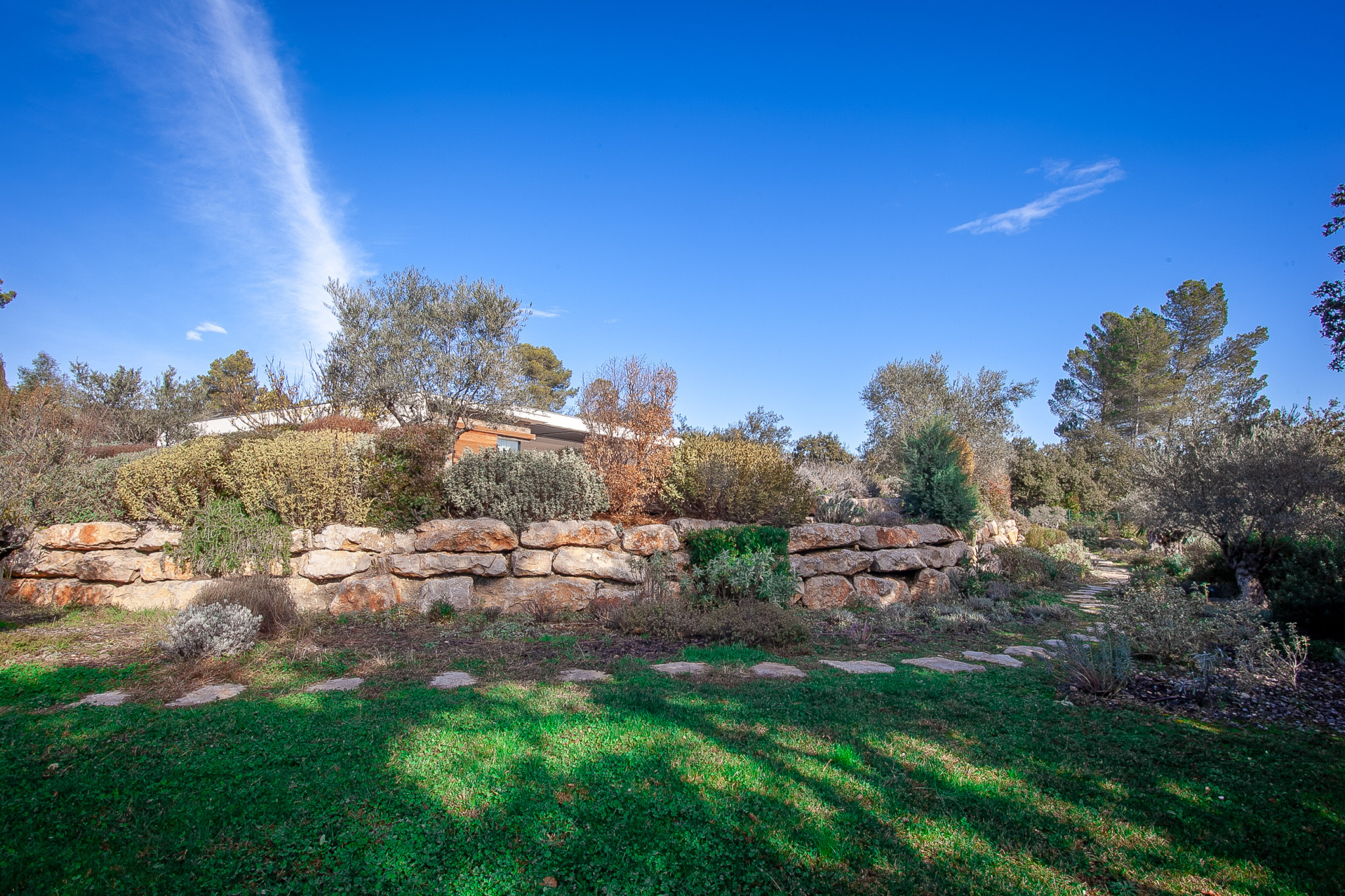 Construite en 2020 avec des matériaux de très haute qualité elle est au coeur d’un parc de 2800m2, entièrement clôturé et magnifiquement arboré qui vous séduira par son atmosphère sereine et ses essences variées disséminées entre les enrochements et les bosquets paysagés.