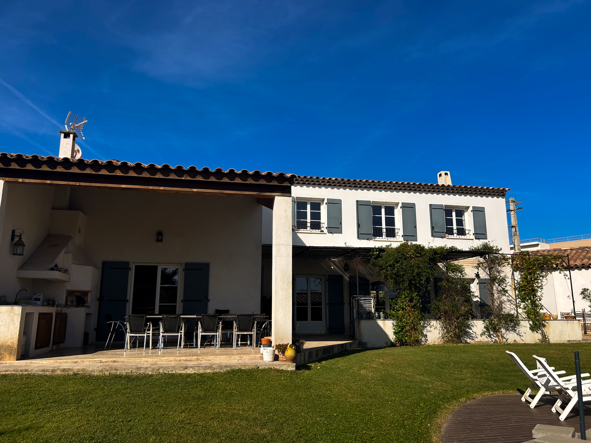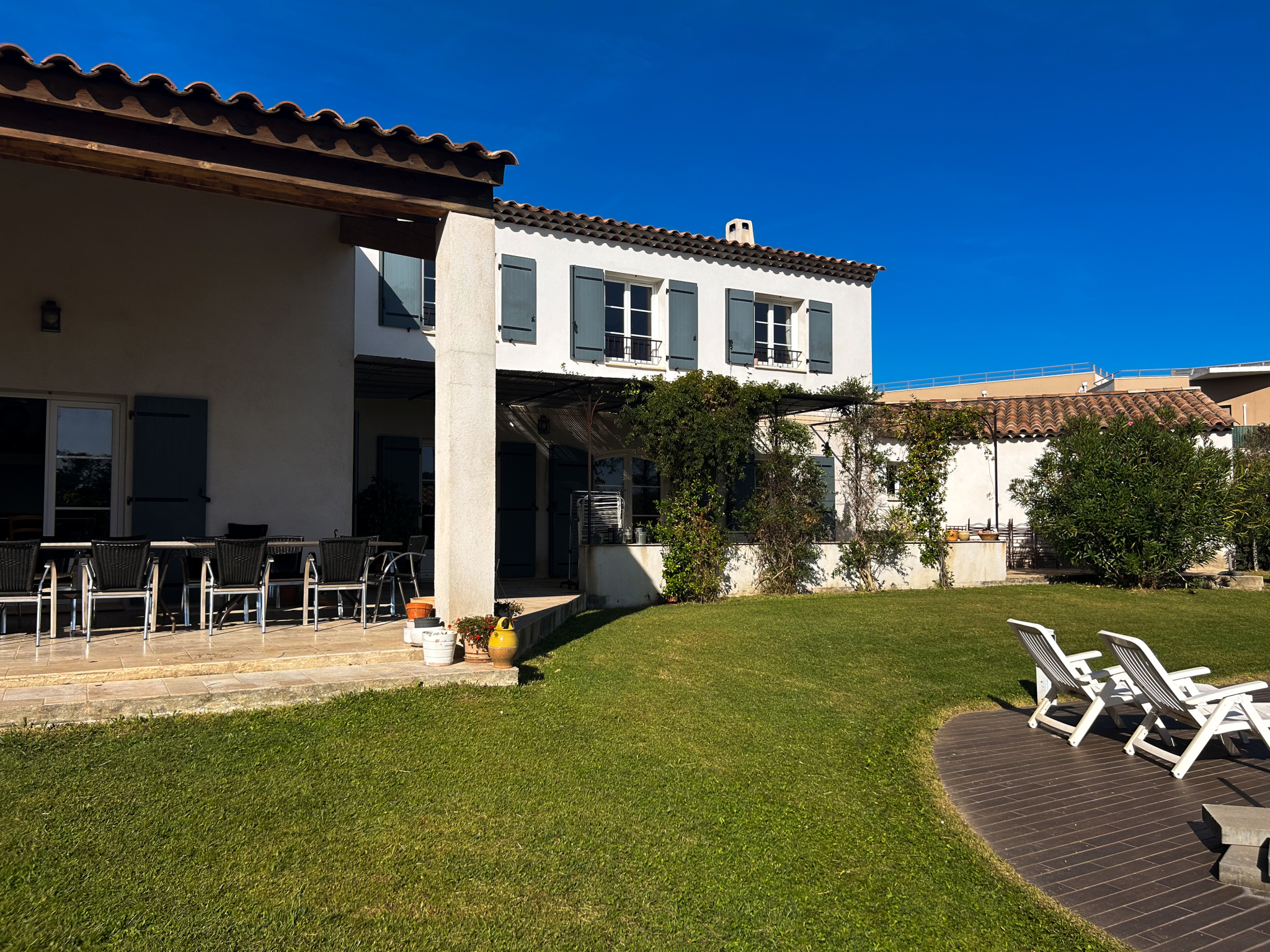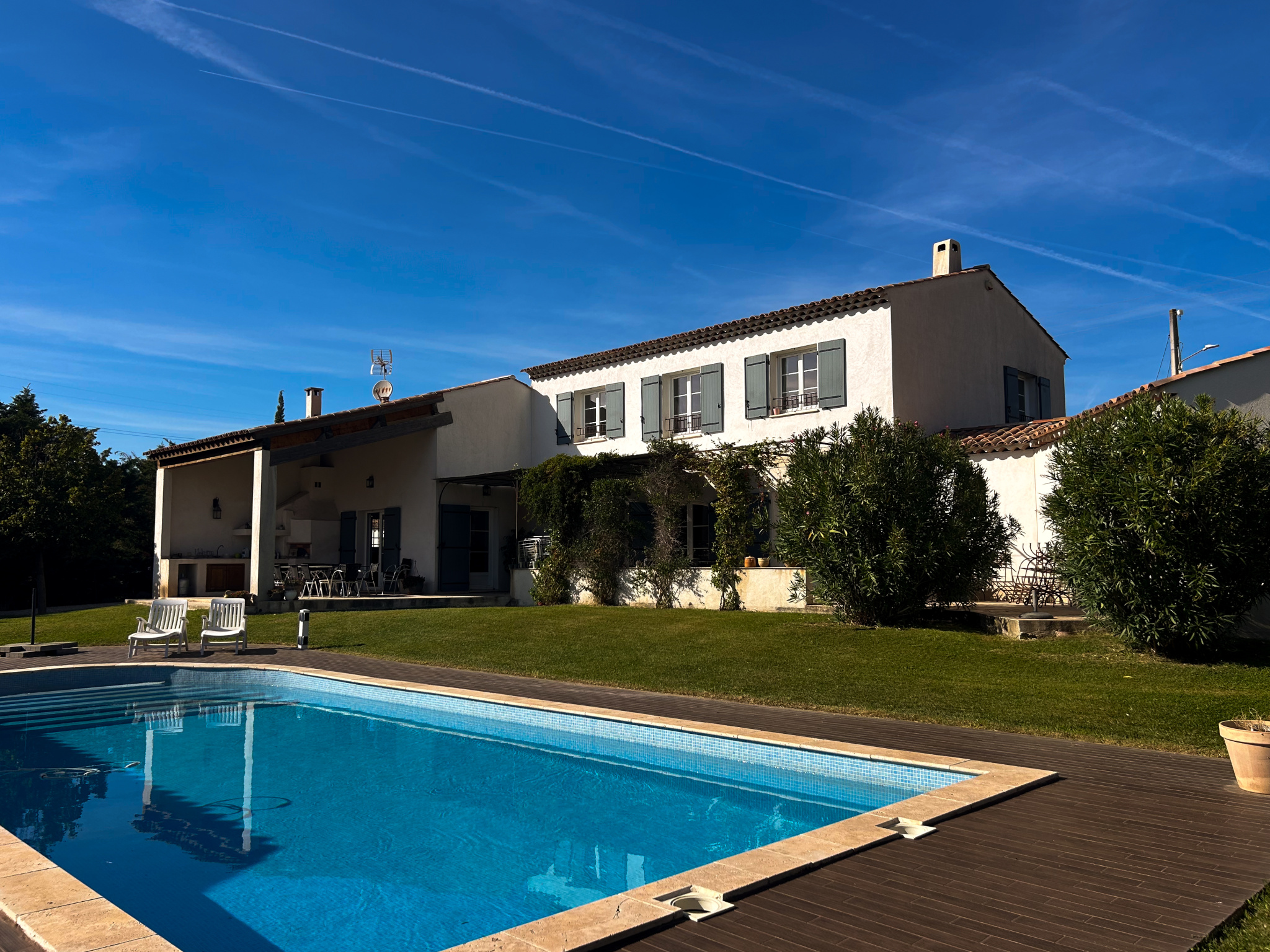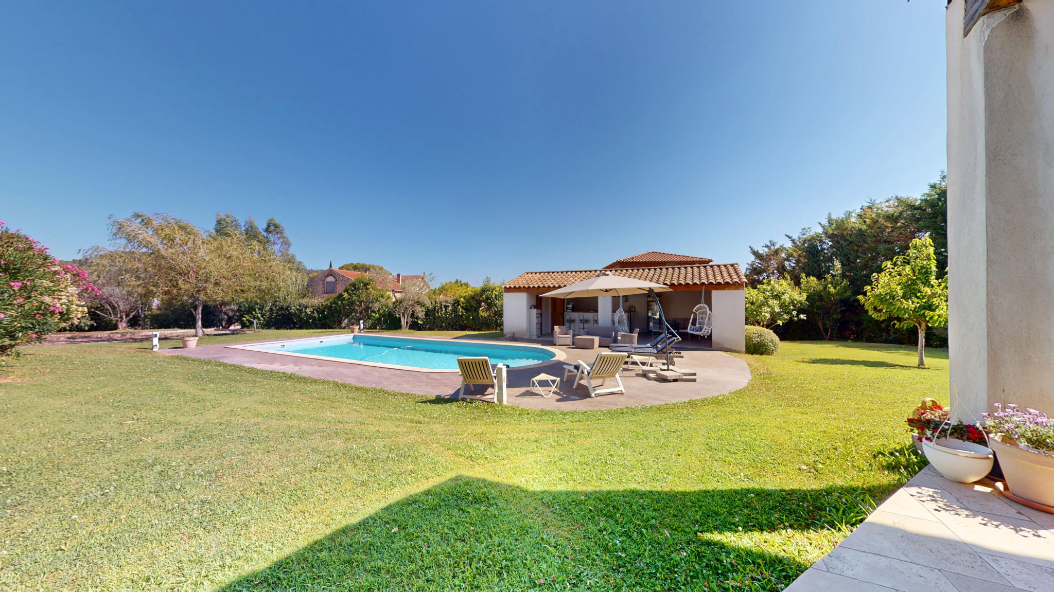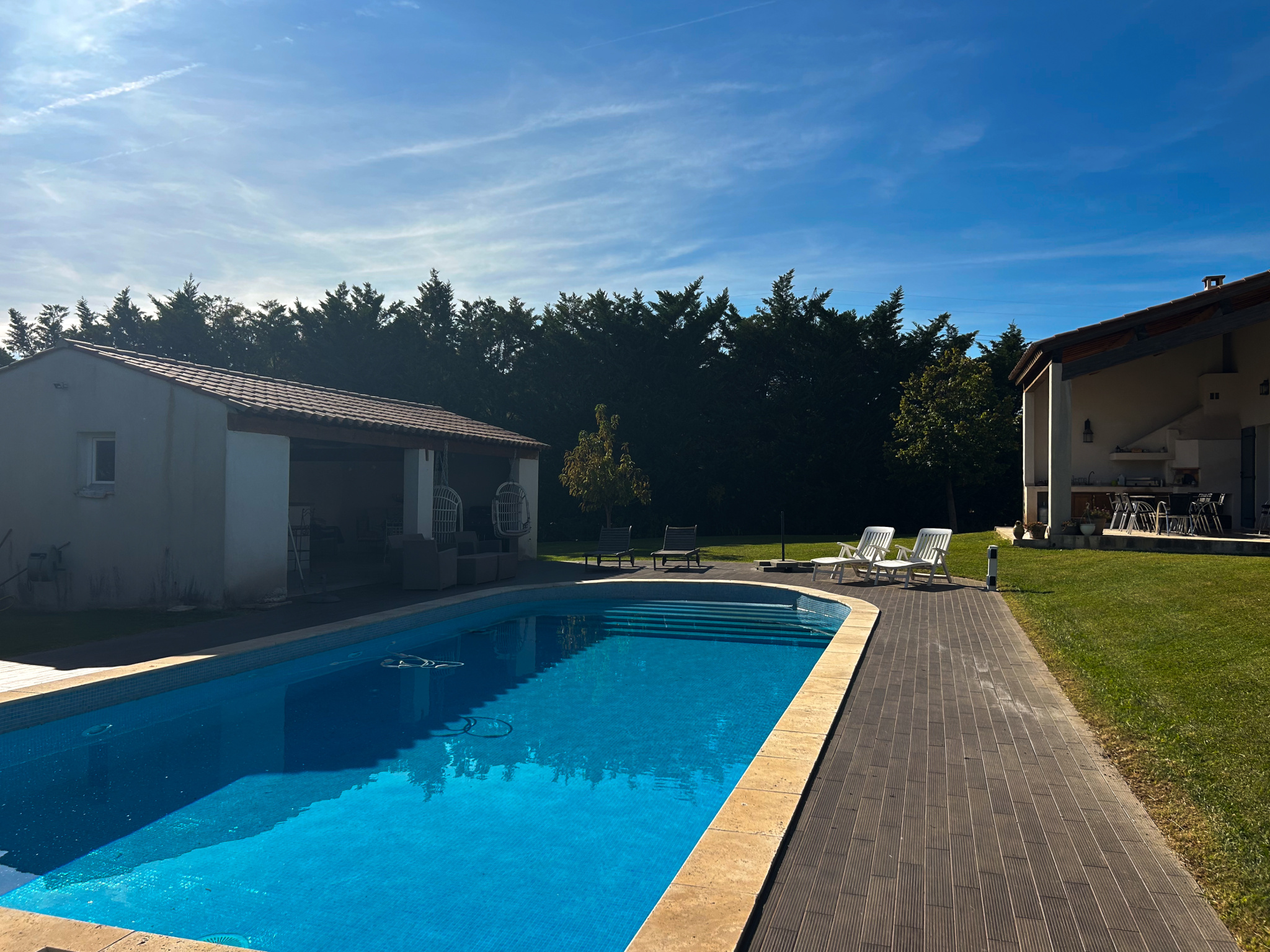 L’espace extérieur de la maison pelousé et arboré est un véritable lieu dédié aux soirées en famille et amis avec sa piscine traditionnelle ( 10/5 ) et son espace Pool-House de 50 m2 avec comptoir, espace cuisine, coin douche et WC.Le tout complété par un terrain de pétanques pour des parties endiablées sous le chant des cigales.