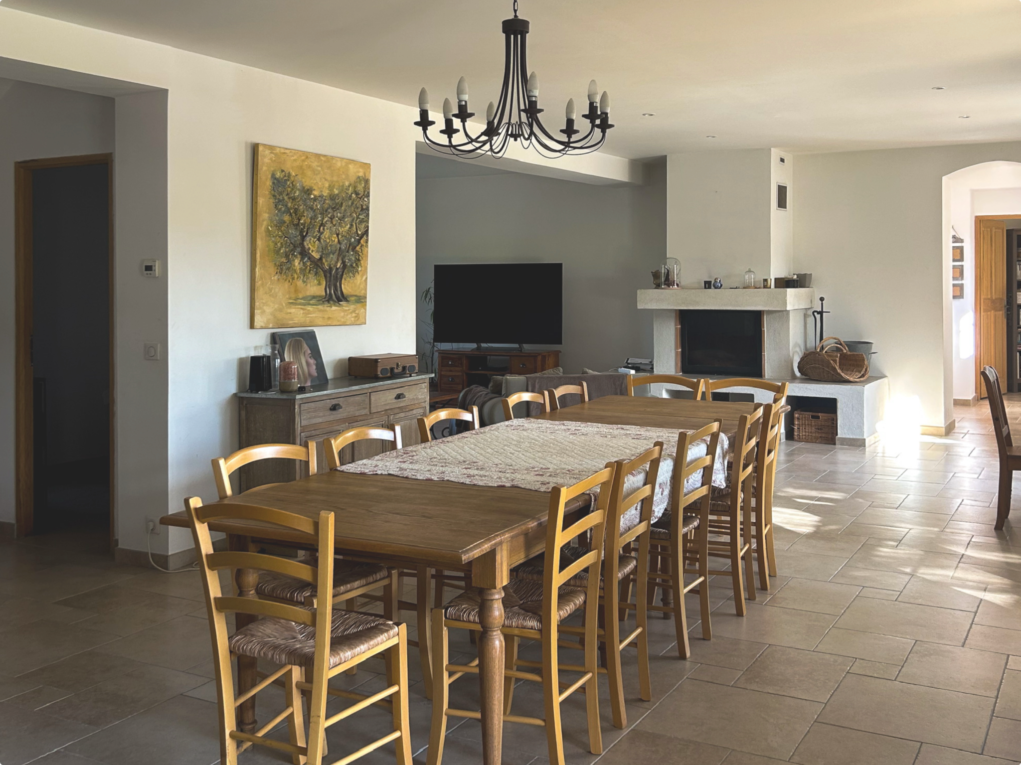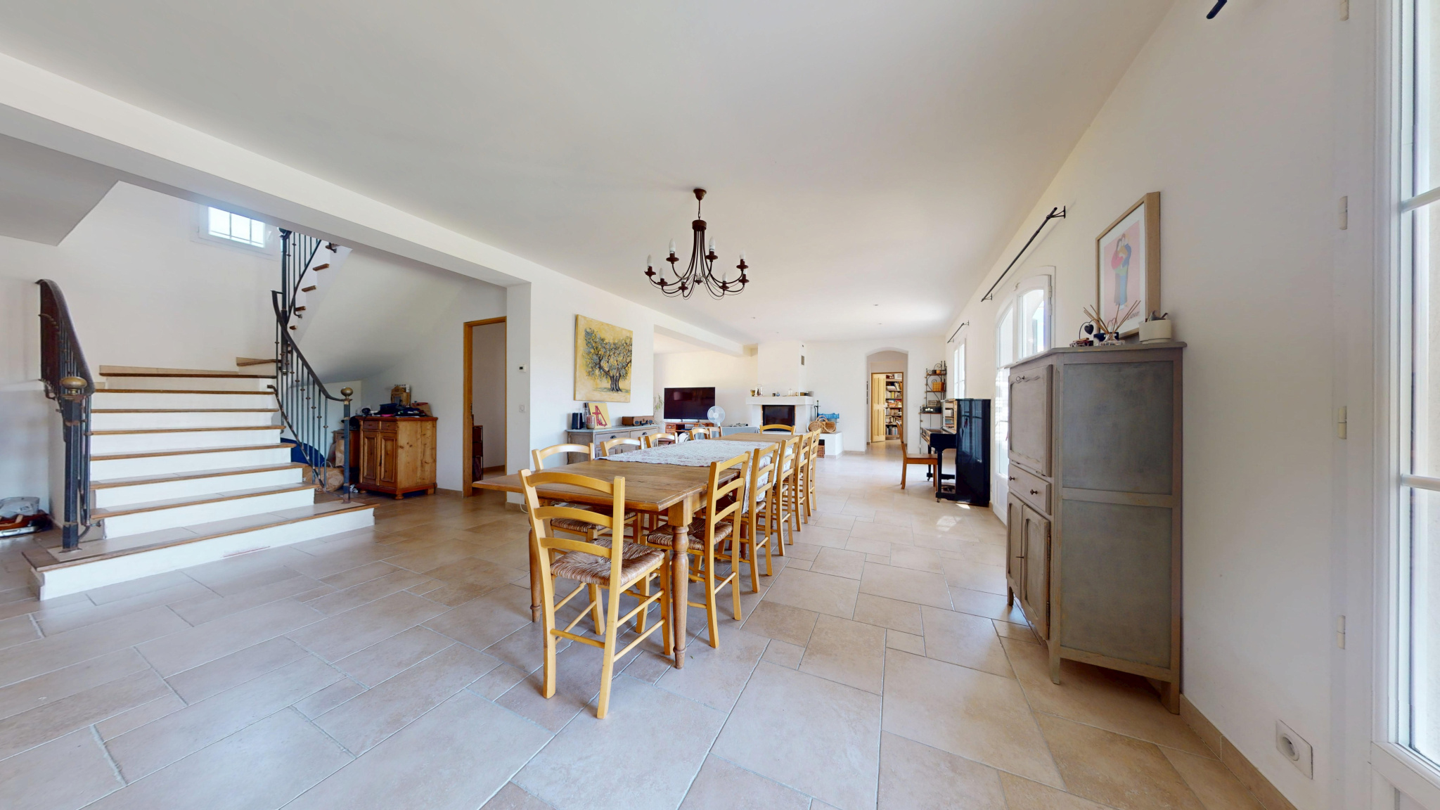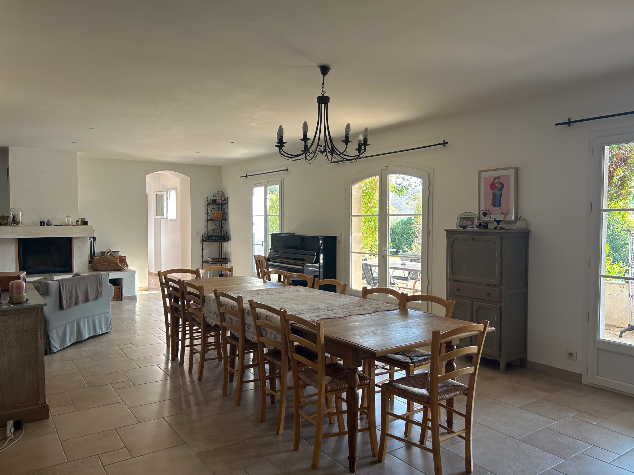 Un salon séjour avec salle à manger d’environ 70 m2 avec cheminée, s’ouvrant sur une terrasse exposée plein SUD avec vue sur le jardin et la piscine.