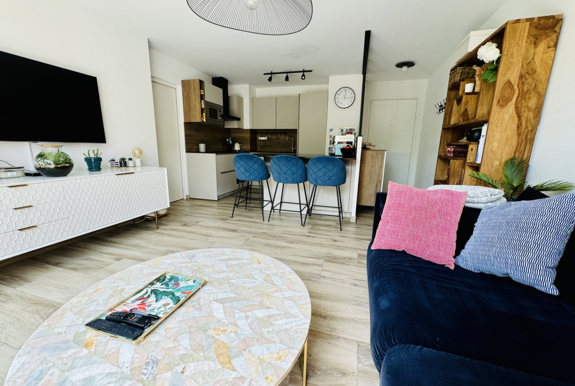 En Mandat Unique, L’immobilière Korine Olivier vous propose sur Aix en Provence, quartier Saint Mitre, dans petite copropriété récente (2022), au CALME absolu, bel appartement de type 3 en rez-de-jardin. D’une superficie de 60,50m2, celui-ci se compose d’une entrée, d’un séjour lumineux donnant sur terrasse et jardin de 180m2, expo Est et sud-est, d’une cuisine ouverte entièrement aménagée et équipée (frigo-congélateur, plaques induction, four, micro-ondes, lave-vaisselle), d’un espace nuit (optimisé grâce aux portes à galandage) comprenant 2 chambres donnant sur le jardin, chacune avec dressing, une salle d’eau avec douche italienne et wc, ainsi qu’une buanderie permettant de mettre lave linge, sèche linge et rangement. Côté jardin, on retrouve une terrasse de 13m2 et un espace verdoyant de 167m2, ainsi qu’une cabane en bois pour le rangement de l’outillage. Prestations : huisseries double vitrage en alu, climatisation réversible neuve (Mai 2023) dans chaque pièce, matériaux de qualité (carrelage, meubles…), volets électriques + volets alu dans les chambres, domotique, fibre, arrosage automatique + goutte à goutte, éclairage extérieur, alarme, ascenseur… Un garage box de 13,50m2 en sous-sol complète ce bien. Appartement coup de coeur où on pose ses meubles !