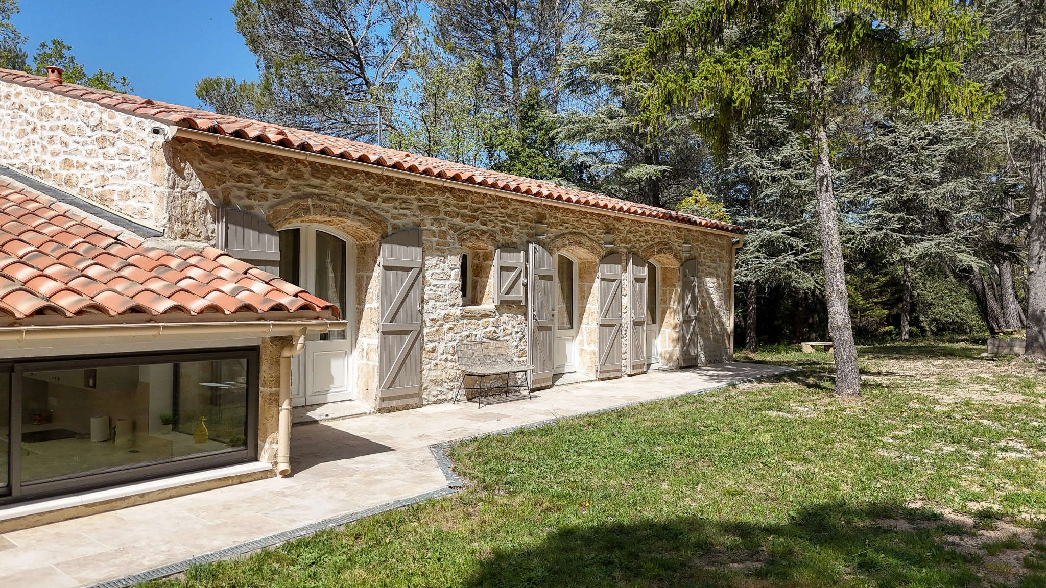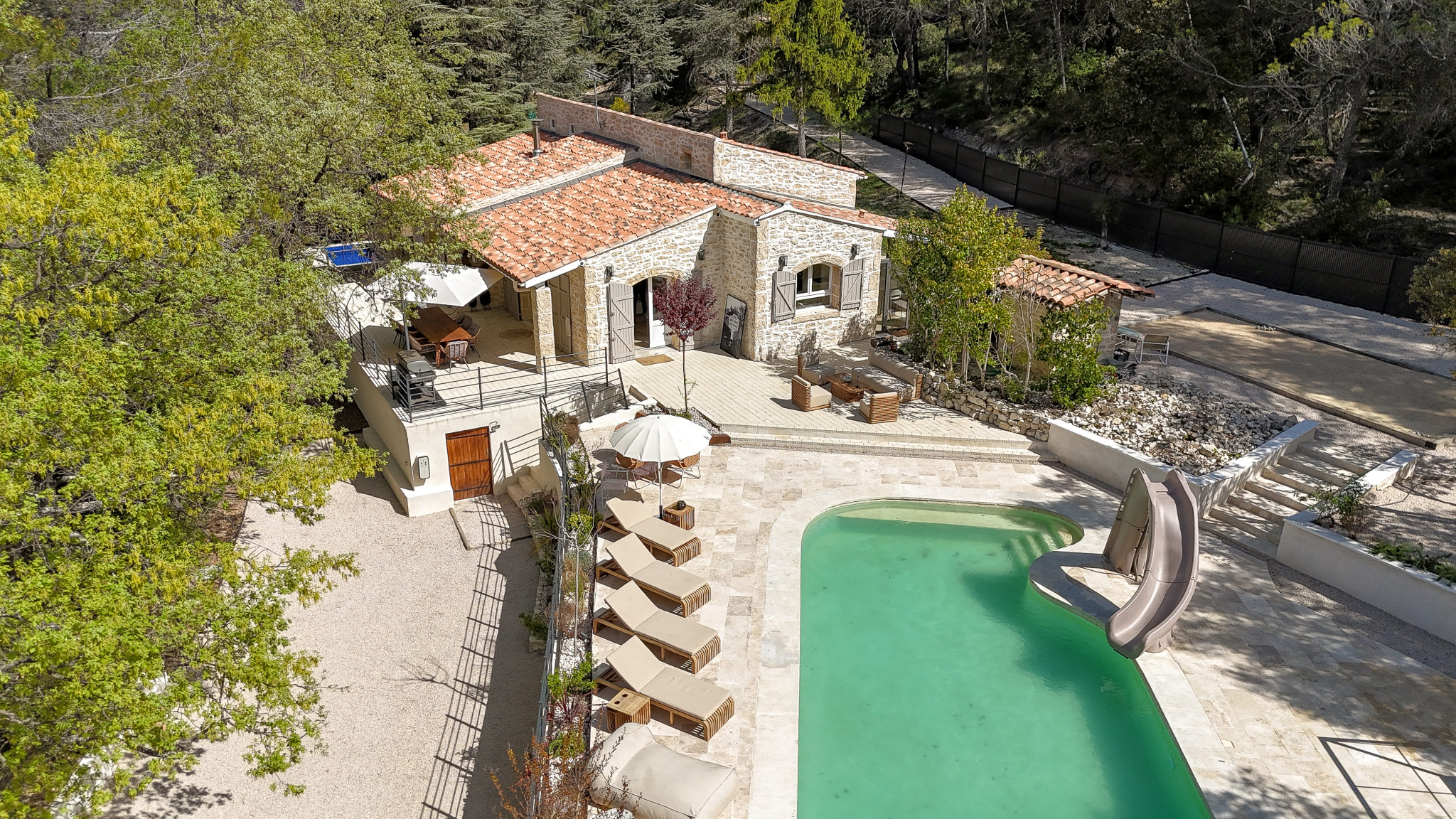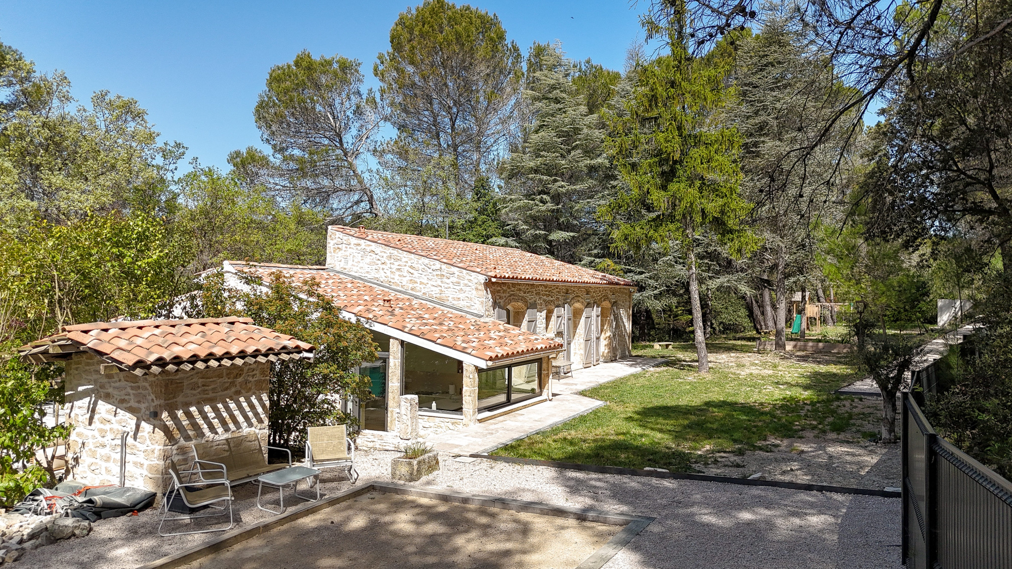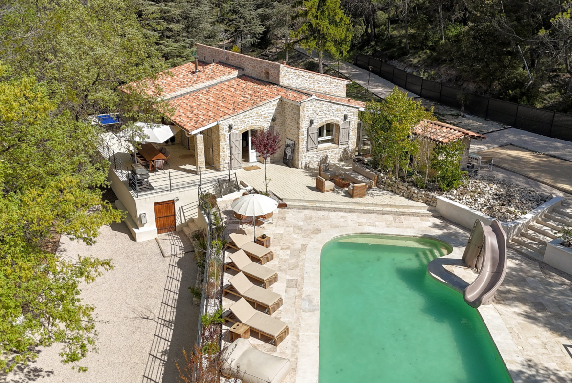 La maison principale, entièrement repensée avec goût propose une belle pièce de vie lumineuse avec pôle à bois, ouverte sur l’extérieur.Un Sol en travertin apportant élégance et chaleur. Une cuisine moderne, aménagée et entièrement équipée.Un espace nuit composé de 2 chambres d’environ 13 m2 dotée chacune de leur douche privative, WC indépendant et d’une suite parentale avec dressing, salle de bain ( douche et baignoire ) et WC indépéndant.