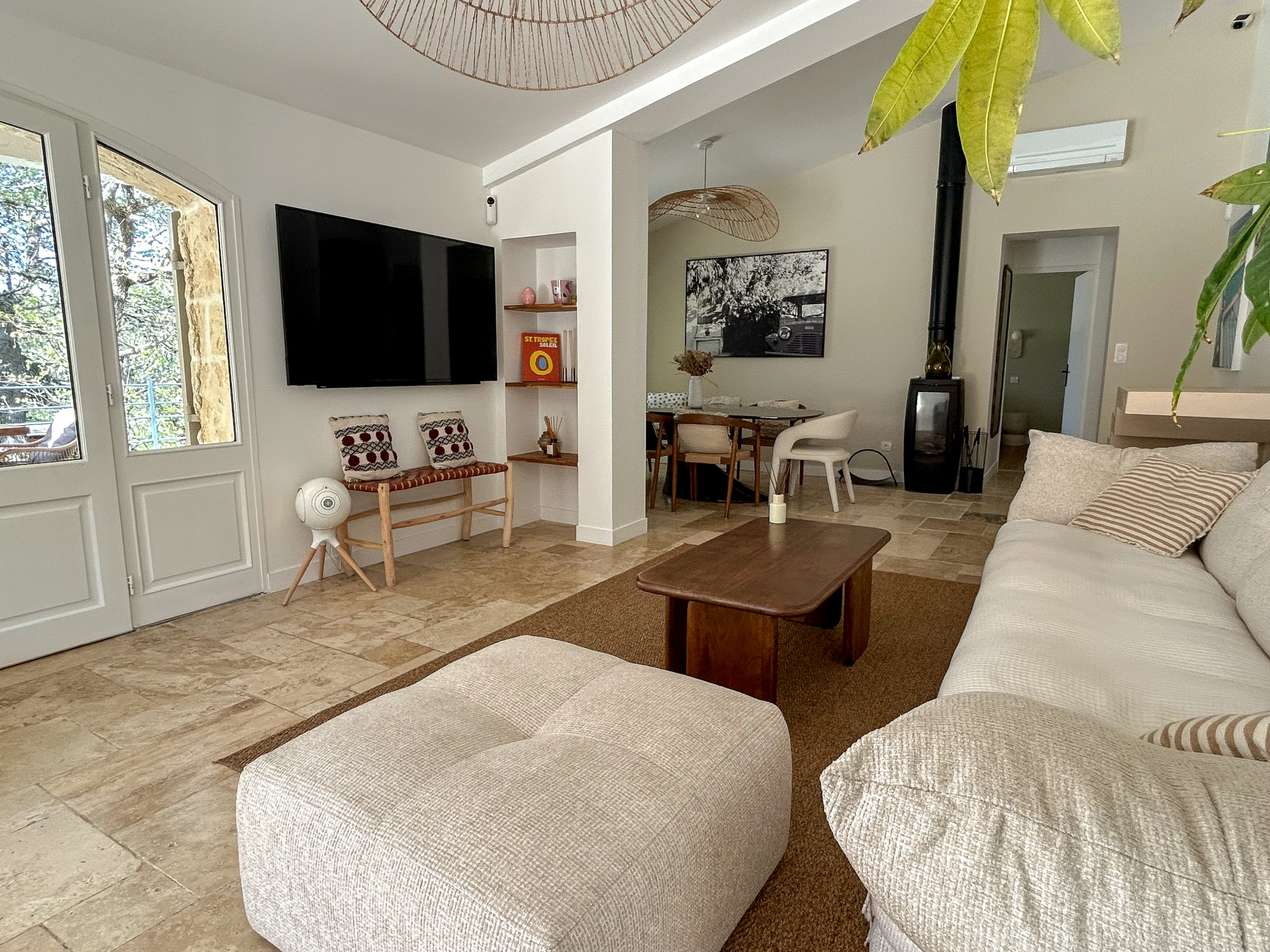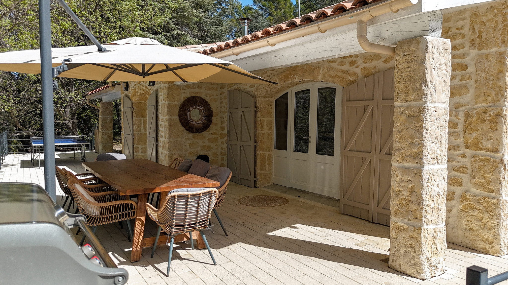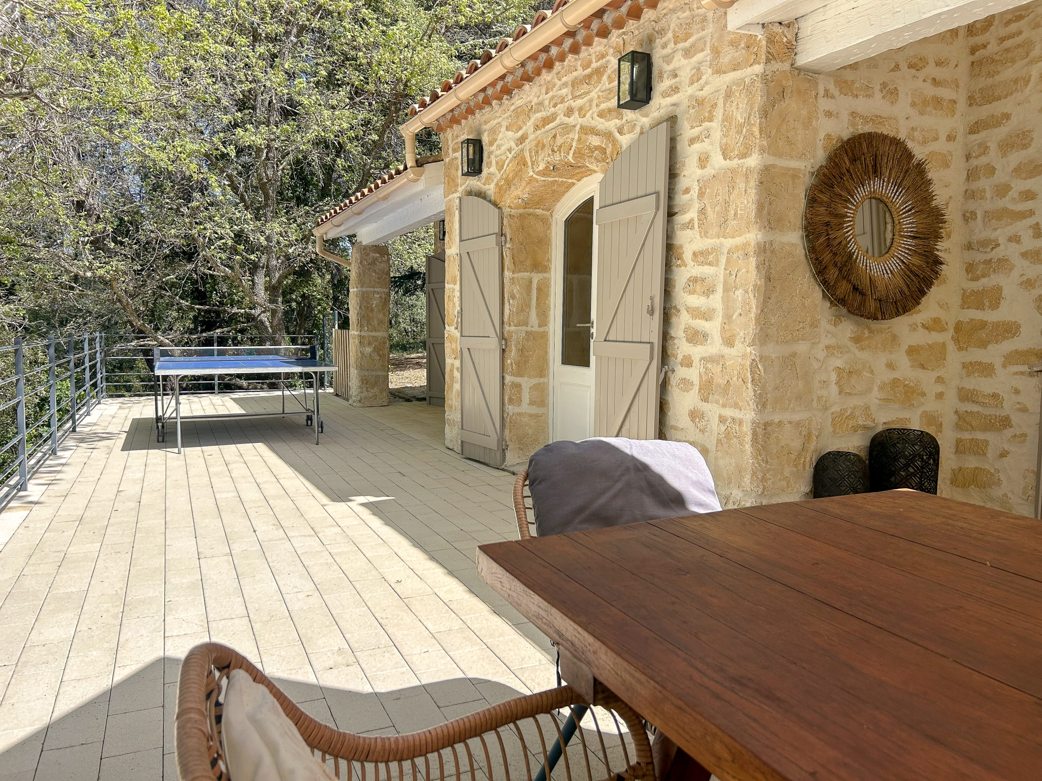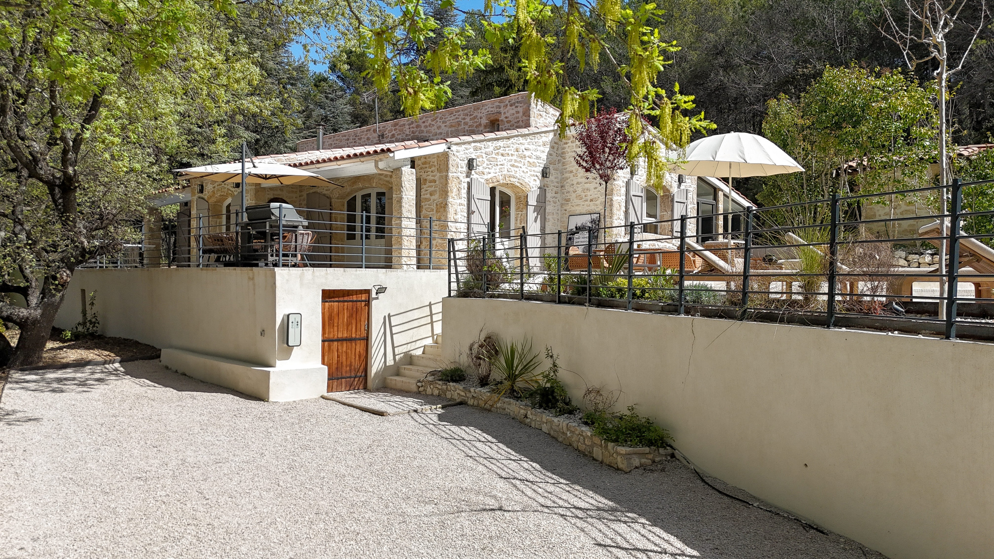 La maison principale, entièrement repensée avec goût propose une belle pièce de vie lumineuse avec pôle à bois, ouverte sur l’extérieur.Un Sol en travertin apportant élégance et chaleur. Une cuisine moderne, aménagée et entièrement équipée.Un espace nuit composé de 2 chambres d’environ 13 m2 dotée chacune de leur douche privative, WC indépendant et d’une suite parentale avec dressing, salle de bain ( douche et baignoire ) et WC indépéndant.